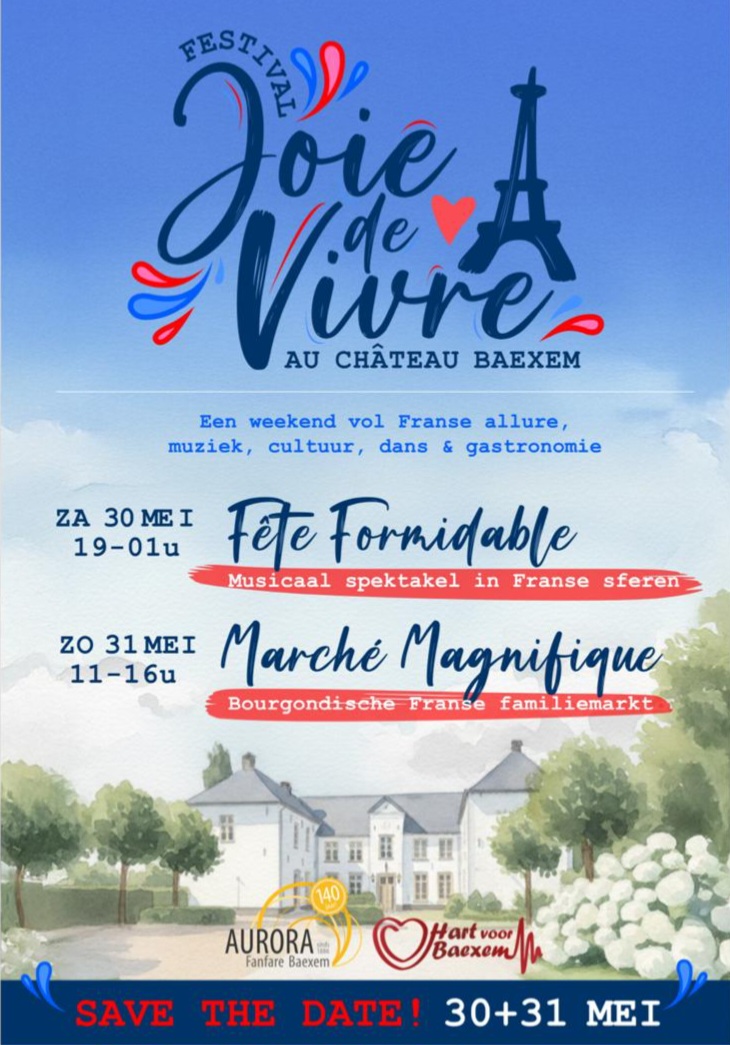 UitgelichtSave the date: Festival Joie de Vivre au Château Baexem is een sfeervol Frans themafestival dat plaatsvindt op zaterdag 30 mei en zondag 31 mei 2026 op de binnenplaats van Kasteel Baexem en de Baronshoeve. In een culturele en muzikale setting, geïnspireerd door Franse muziek, gastronomie en kunst, waant u zich even in Frankrijk. Laat u meevoeren in Franse sferen vol muziek, smaak en beleving. Zaterdag 30 mei: Misicaal spektakel in Franse sferen. Zondag 31 mei: Bourgondische Franse Familiemarkt. Meer info volgt snel!